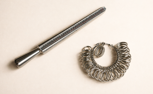 Mit dem Ringmaßstab (Ringstab) und dem Ringspiel kannst du die passende Ringgröße einfach selbst ermitteln. So findest du zuverlässig die Größe, die später auch im Alltag angenehm sitzt.