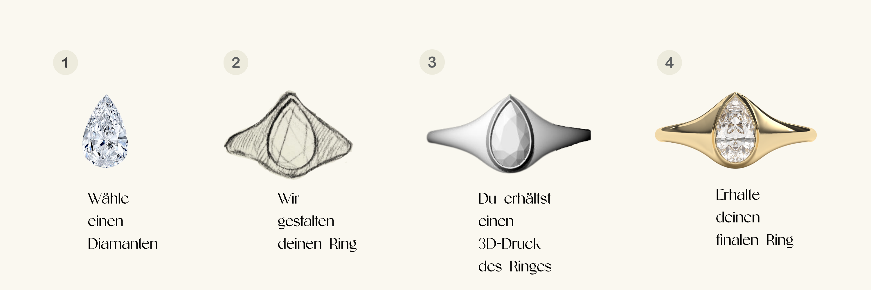 Von der Idee bis zum fertigen Ring, ein strukturierter Prozess, der dir Sicherheit gibt. Nachhaltige Diamanten, CAD-Design, 3D-Druck und europäische Fertigung.
