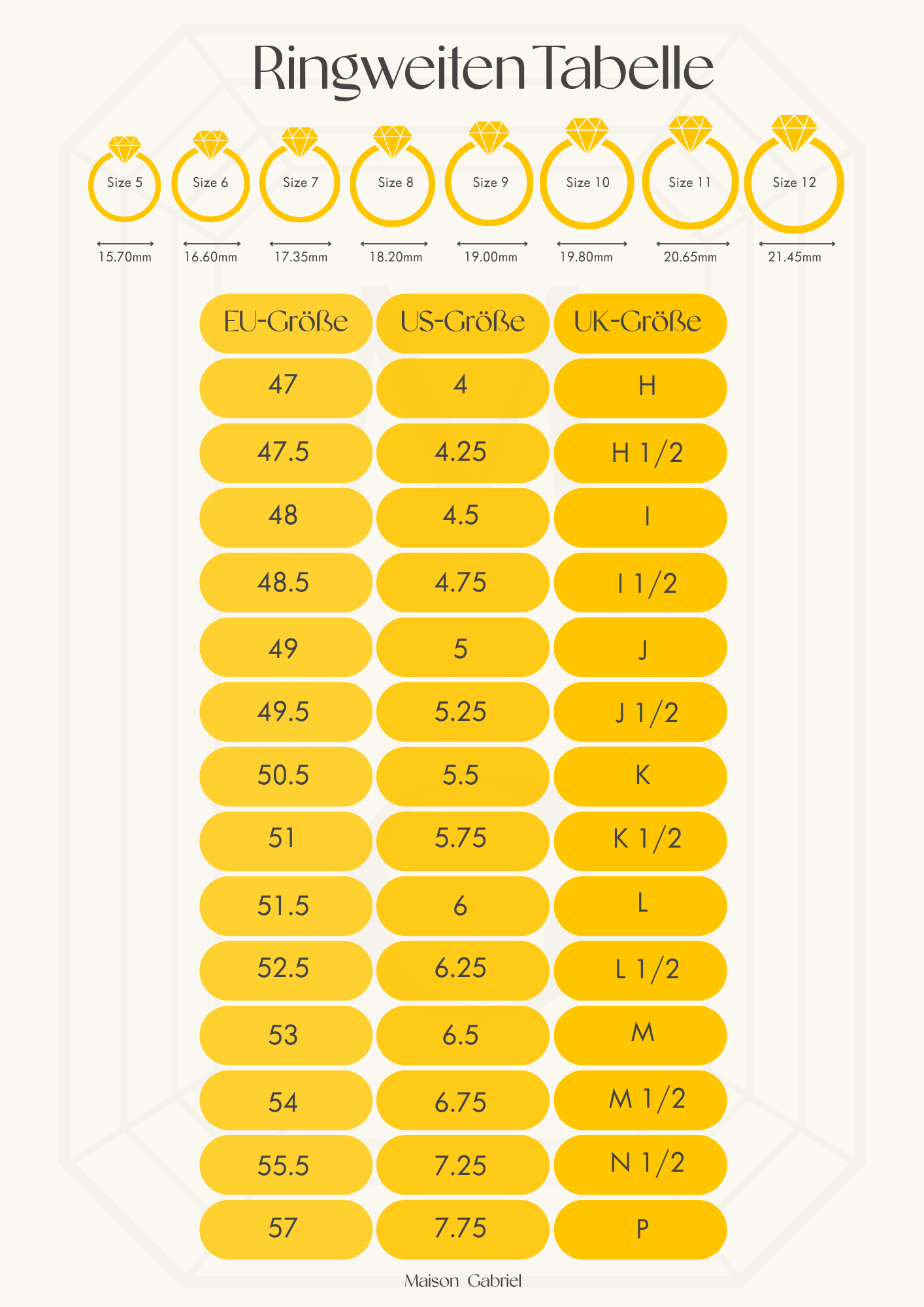 Um deine genaue Größe zu ermitteln, miss den Innendurchmesser deines Lieblingsrings oder bestelle kostenlos unseren Ringgrößenmesser.