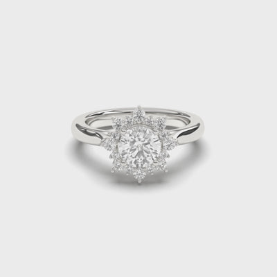 Im Zentrum steht ein 1 ct großer Round Brilliant Labordiamant, umgeben von 0,36 ct kleinerer Diamanten, die wie Sonnenstrahlen angeordnet sind.