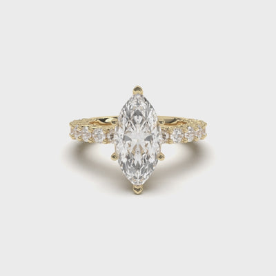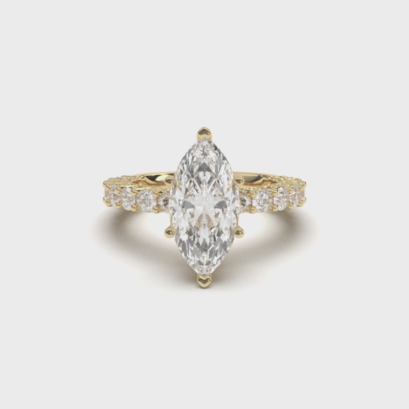 Der 3,58 ct große Marquise-Labordiamant wird von sechs Krappen gehalten, umgeben von einem feinen Halo, das den Stein optisch schwebend erscheinen lässt.