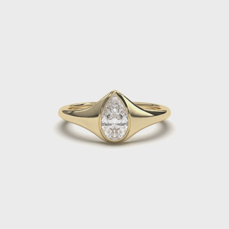Der 0,75 ct große Pear Shape Labordiamant ist tief in 18 K Gelbgold gefasst, geschützt, elegant und architektonisch klar.