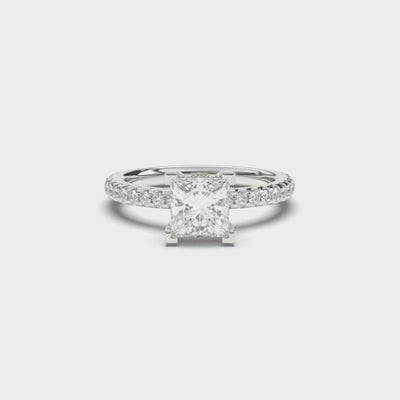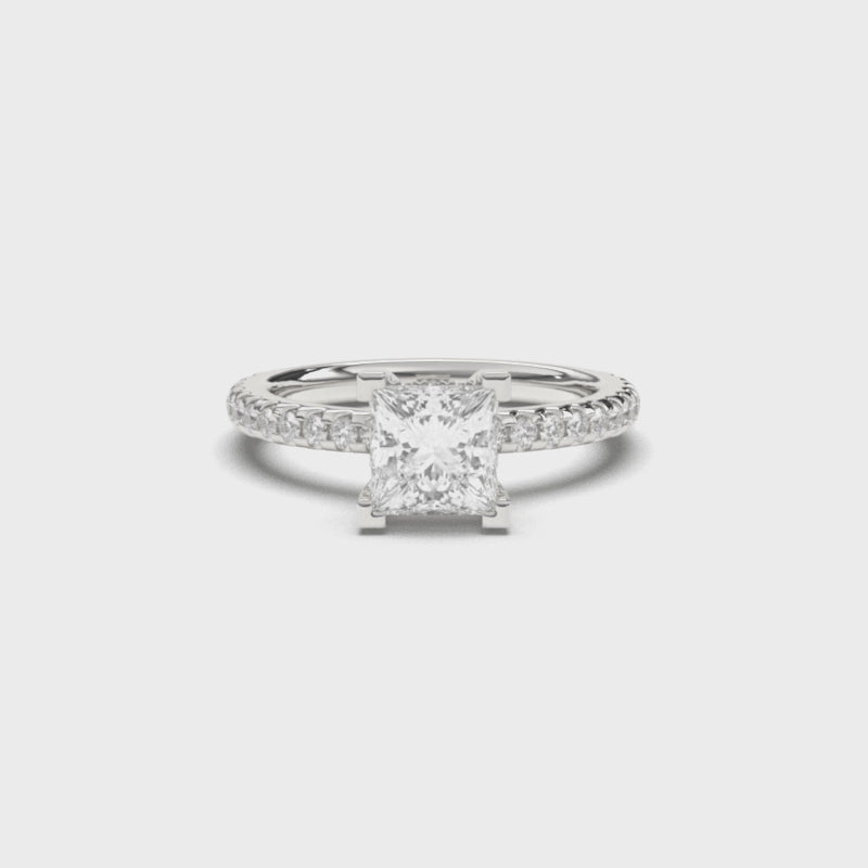 Der 1,5 ct Princess Cut Labordiamant sitzt in einer aufgesetzten Vier-Krappen-Fassung, flankiert von feinen Pavé-Steinen entlang der Ringschiene. Unterhalb des Hauptsteins, versteckt sich ein hidden Halo.