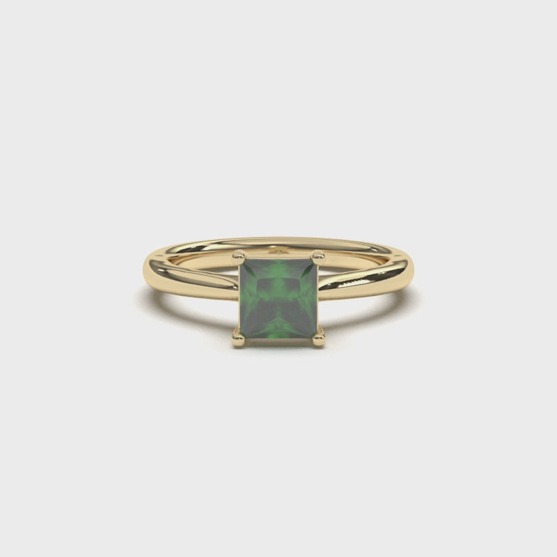 Dieser Ring basiert auf der ikonischen Soline-Fassung, angepasst für einen außergewöhnlichen Stein: einen Fancy Green Princess Cut mit 1 ct und VVS2-Reinheit.