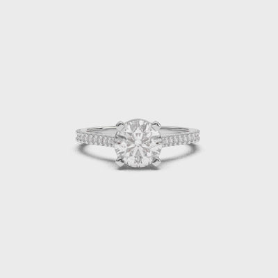 Die nur 1,5 mm schmale Schiene unterstreicht die Leichtigkeit des Designs und bringt gleichzeitig die Pavé-Diamanten zur Geltung, die in feiner Linie entlang der Ringschiene gesetzt sind. Bei jeder Bewegung fängt der Ring das Licht ein – dezent, elegant, und voller Charakter. Die filigranen Krappen umschließen den Mittelstein sicher und öffnen ihn optisch für maximales Strahlen.